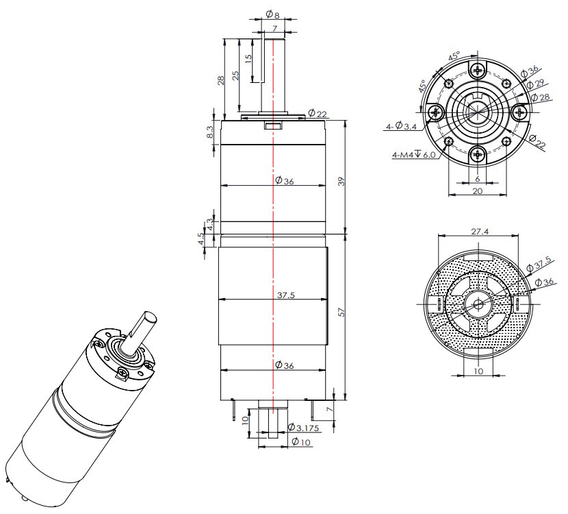 - แบบเพลา Ø8 ยาว 25mm (ตามแบบ 2D) และมีหน้าจานยึดรูเกลียว 4-M4 ระบุในแบบ