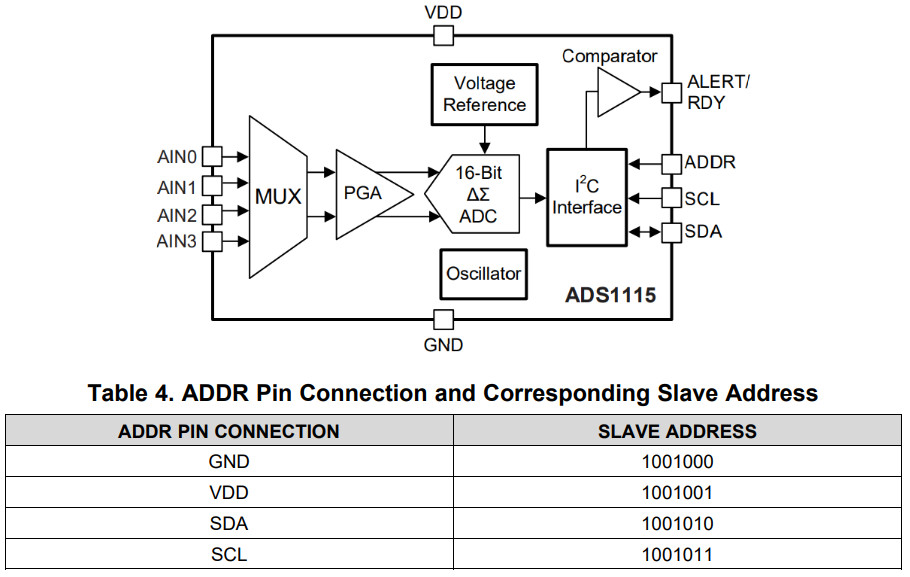 ADS1115 ไม่เพียงแต่สามารถรองรับการรับอินพุตแรงดันสัญญาณอนาล็อกแบบสี่ช่อง (Single-Ended) เท่านั้น แต่ยังสามารถรับอินพุตแรงดันสัญญาณแบบดิฟเฟอเรนเชียล (Differential) ได้ 2 คู่ ได้แก่ A0 (P) / A1 (N) และ A2 (P) / A3 (N) อีกด้วย นอกจากนี้ยังสามารถตั้งค่าแรงดันภายในเป็นค่าขีดจำกัด (Threshold Voltage) เพื่อใช้เปรียบเทียบกับสัญญาณอินพุตจากภายนอก และส่งสัญญาณขัดจังหวะ (Interrupt Signal) เมื่อแรงดันถึงค่าที่กำหนด.