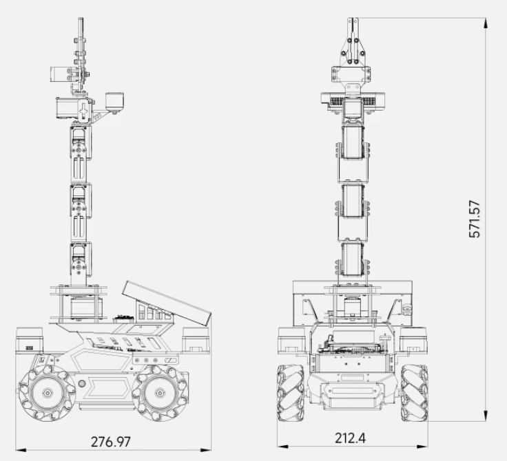 | 🔹 โครงสร้าง (Chassis) | อลูมิเนียมอัลลอย, ล้อ Mecanum 80 mm, โครงช่วงล่างแบบ Pendulum Suspension |