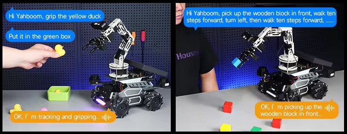 “Hi Yahboom, pick up the wooden block in front, walk ten steps forward, turn left, then walk ten steps forward.”