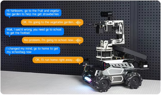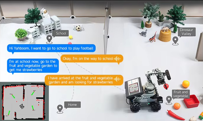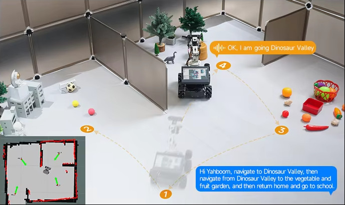 “Hi Yahboom, navigate to Dinosaur Valley, then to the vegetable and fruit garden, and finally return home.”