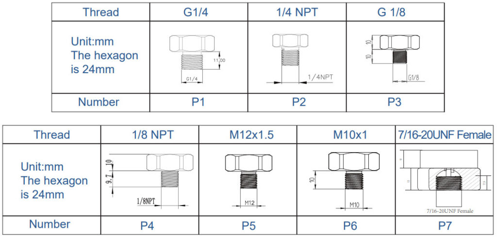 - G1/4, 1/4 NPT, M10x1, M12x1.5, G1/8, 1/8 NPT, 7/16-20UNF