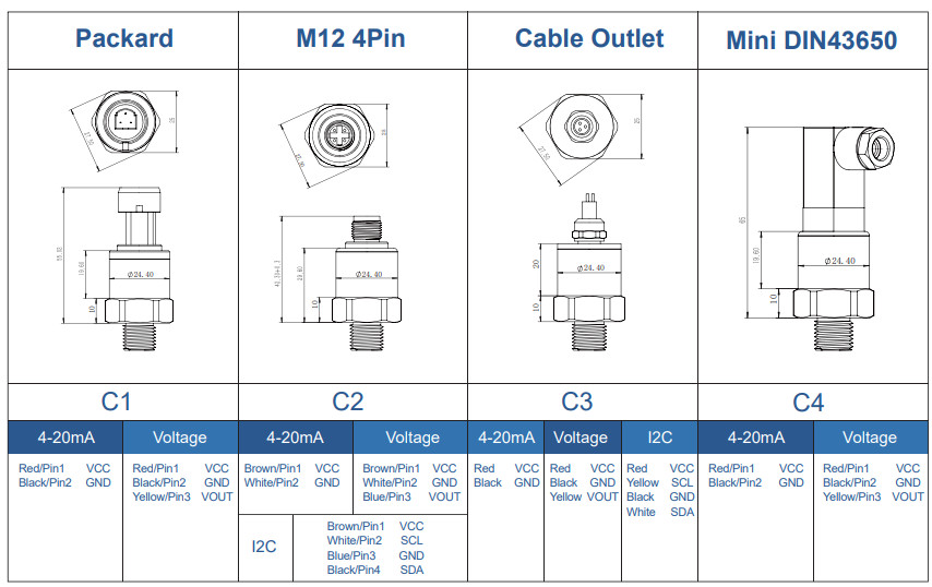 Pressure Gauge Type G: ประเภทความดัน (G = Gauge, S = Sealed)Range A: ช่วงแรงดัน (A = 10 bar, … F = 60 bar)C4: ขั้วต่อไฟฟ้า Electrical Connection (Mini DIN43650)4: รูปแบบสัญญาณเอาต์พุต Output 0-10VP1: ขนาดเกลียว Process connection G1/4, ( P2 = 1/4NPT, P7 = 7/16-20UNF Female)