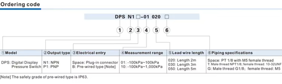 | DPS N1 B-10 020 G | NPN Output, Pre-wired 2 m, ช่วงแรงดัน -100~1000 kPa, เกลียว G1/8 |