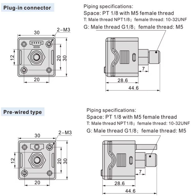 - ชนิดเกลียว / Port Thread PT 1/8, NPT 1/8, G 1/8, M5 ขึ้นอยู่กับรุ่นย่อย