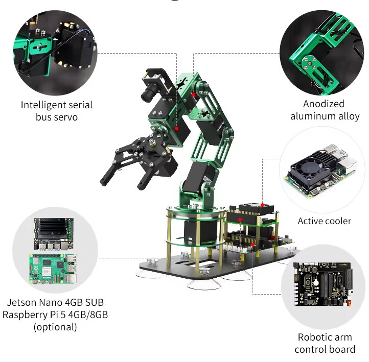 DOFBOT คือหุ่นยนต์แขนกลเพื่อการศึกษา เหมาะสำหรับผู้เริ่มต้นด้าน AI, คนที่ชอบเขียนโปรแกรม และแฟน ๆ Jetson Nano ออกแบบมาให้ใช้งานกับ Jetson Nano 4GB SUB และ Raspberry Pi 5 ตัวเครื่องผลิตจากอลูมิเนียมชุบเขียว แข็งแรงและสวยงาม มาพร้อมกล้อง HD, เซอร์โวมอเตอร์คุณภาพสูง 6 ตัว และบอร์ดขยายอเนกประสงค์ รองรับฟังก์ชัน AI ด้านการมองเห็นมากมาย เช่น การติดตามสี ตรวจจับท่าทาง แยกขยะ และจดจำใบหน้า