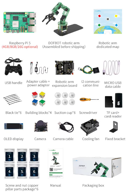 DOFBOT คือหุ่นยนต์แขนกลเพื่อการศึกษา เหมาะสำหรับผู้เริ่มต้นด้าน AI, คนที่ชอบเขียนโปรแกรม และแฟน ๆ Jetson Nano ออกแบบมาให้ใช้งานกับ Jetson Nano 4GB SUB และ Raspberry Pi 5 ตัวเครื่องผลิตจากอลูมิเนียมชุบเขียว แข็งแรงและสวยงาม มาพร้อมกล้อง HD, เซอร์โวมอเตอร์คุณภาพสูง 6 ตัว และบอร์ดขยายอเนกประสงค์ รองรับฟังก์ชัน AI ด้านการมองเห็นมากมาย เช่น การติดตามสี ตรวจจับท่าทาง แยกขยะ และจดจำใบหน้า