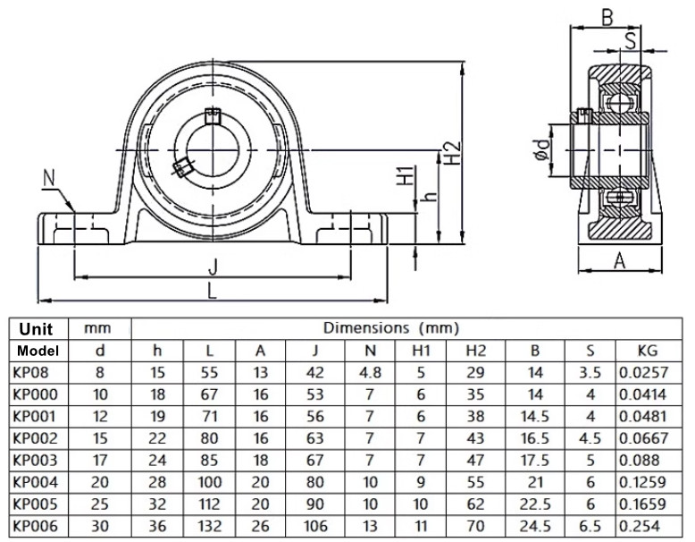 ตลับลูกปืนแบริ่ง แนวตั้ง ตลับลูกปืนยูนิต (Pillow Block Bearing) รุ่น KP08 ซึ่งเป็นรุ่นยอดนิยมสำหรับงานที่ต้องการการติดตั้งง่าย มีความมั่นคง และใช้งานกับเพลาขนาด 8 มิลลิเมตร