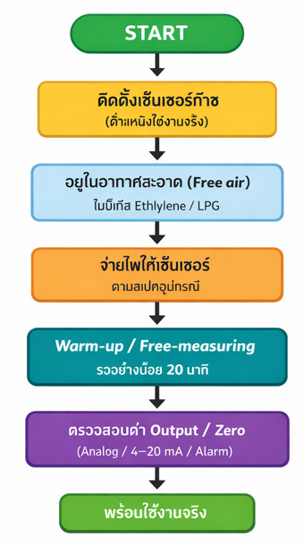 - ติดตั้งเซ็นเซอร์ในบริเวณที่เป็นอากาศสะอาด (Free air) ไม่มีไอแก๊ส Ethylene, LPG หรือก๊าซอื่น ๆ ปะปน