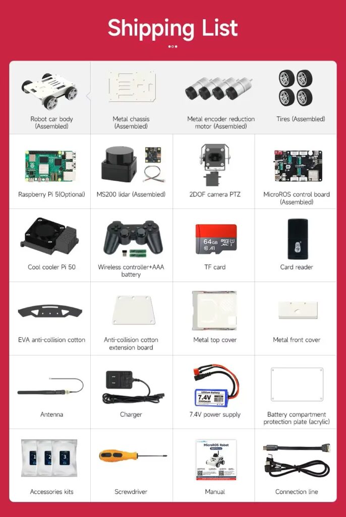 หุ่นยนต์ MicroROS Raspberry Pi5 Robot Car MicroROS-Pi5 ROS2 robot with ESP32-Micro ROS robot expansion board 310 encoder motor lidar camera based on Raspberry Pi 5