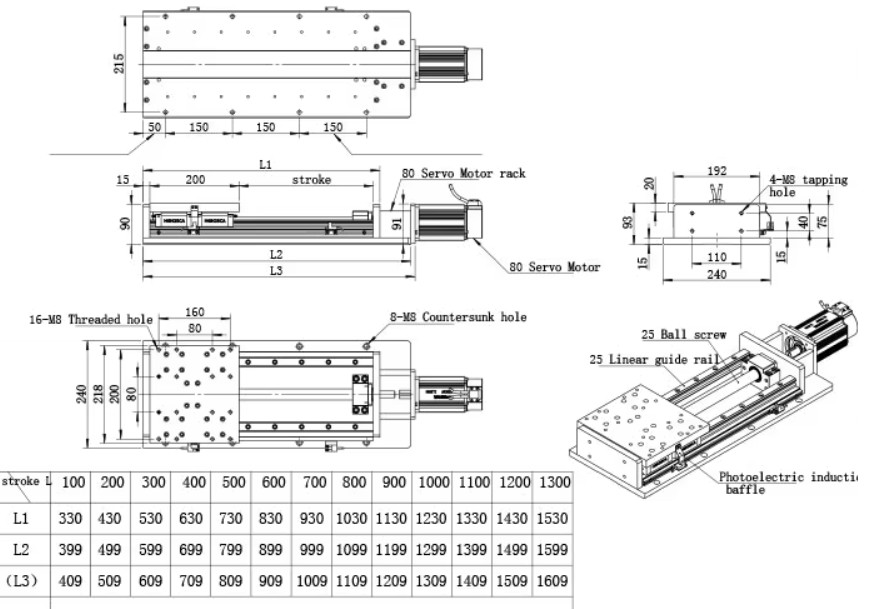 Drawing และตารางขนาดของ Linear Slide Module แบบบอลสกรู พร้อมรางนำทาง (Linear Guide Rail) และติดตั้งมอเตอร์เซอร์โว โดยมีข้อมูลสำคัญดังนี้: